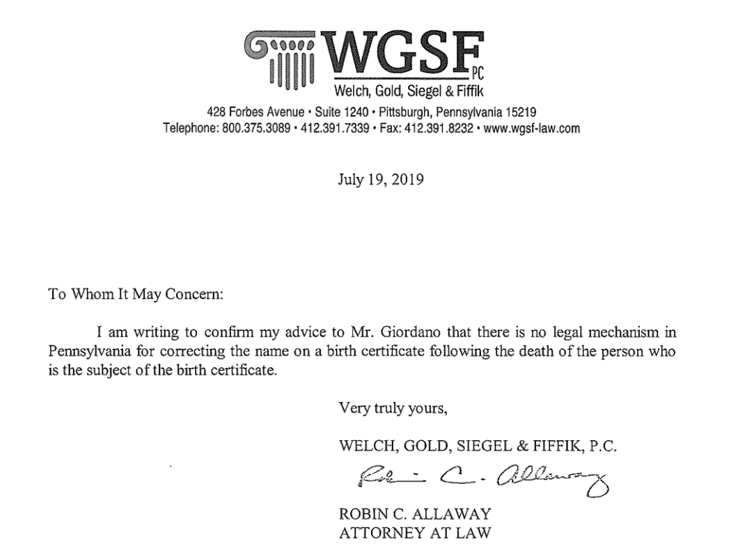 So my GGF went by this name in most documents looks to be around 20 years old. His name listed on death certificate was Charles Giordano George. And then my GF's father's name on his birth certificate is Charles George. So naturally, my GF name on his birth certificate is Joseph George. Great! My aunt had told me that she had looked into updating the information because it's wrong, and PA said that if the person's deceased, it cannot be changed. (Not all states are like this! If you have a name discrepancy you may have to do something different!)